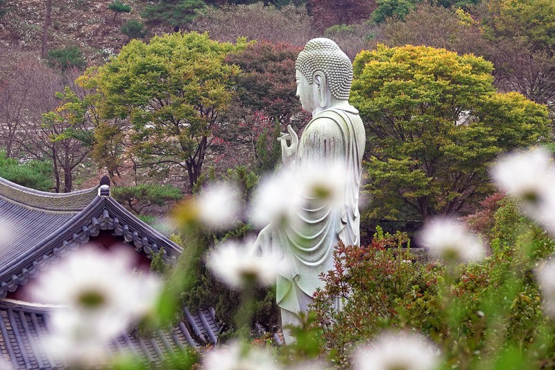 봄에는 철쭉으로, 가을이면 구절초로 하얗게 뒤덮이는 아미타 대불의 모습입니다.