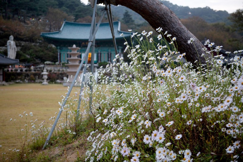 소박한 듯 품격 있는, 청초한 구절초 꽃이 가을바람에 가녀린 몸을 맡긴 채 하늘거리는 모습은 아름다운 향기와 함께 주변을 환하게 밝혀주는데 그저 바라만 봐도 행복하게 해주는 꽃으로 영평사의 진입로부터 시작된 구절초 군락은 일주문을 지나 대웅보전의 뒤 산비탈은 물론 대웅보전의 맞은편 언덕까지 피어나며 숲을 하얗게 만들고 있습니다.