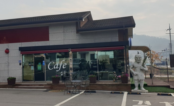휴양림에 들어서면 이순신 동상과 카페가 있습니다.