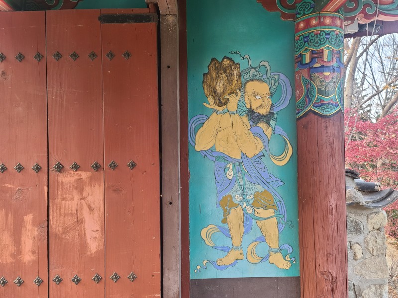 비교적 작은 절인 천주사에 입장할 때 보이는 사천왕도 위엄있는 큰 조각상이 아닌 실용적인 오래된 불화가 자리잡고 있습니다.