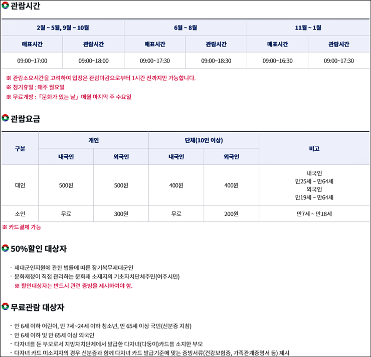 관람 요금 : 성인 기준 500원/ 할인 및 무료관람 대상자인지 확인하는 것이 좋습니다.