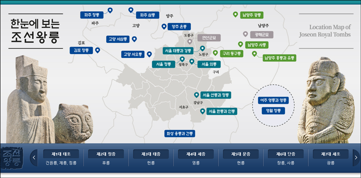 조선시대 왕릉은 도읍지의 4대문 10리 밖 80리 안에 위치해야 한다고 법으로 정해놓았습니다. 오늘날의 100리로, 당시의 10리는 요즘의 4km가 아니고 5.2km로 임금의 참배 행렬이 하루에 도착할 수 있는 거리를 기준으로 하여 대부분 도읍지인 한양 주변에 있습니다.