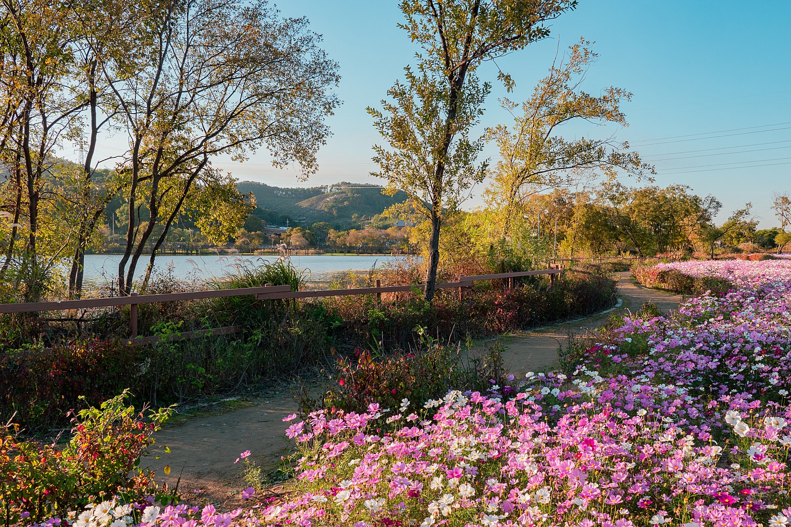 정호의 시원한 풍경과 코스모스를 동시에 감상할 수 있는 이곳은 단순히 꽃을 보는 것 이상의 감동을 선사하며, 여유롭게 시간을 보내고 싶은 이들에게 더할 나위 없이 좋은 힐링의 장소입니다.