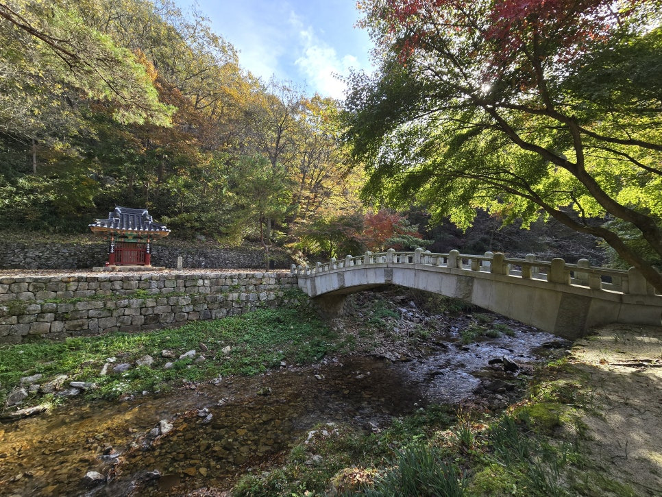 다시 호젓한 단풍 걸음은 이어져 강천사 도량으로 들어서는 산문 중 첫 번째 문인 일주문 사이로 보이는 가을 어디쯤으로 발걸음을 재촉합니다. 눈은 단풍에 꽂혀서 현기증이 날 지경이고 멍 때리게 하는 청아한 물소리, 새소리, 바람 소리는 심신 안정제가 되어 호젓한 산길을 걷게 합니다.