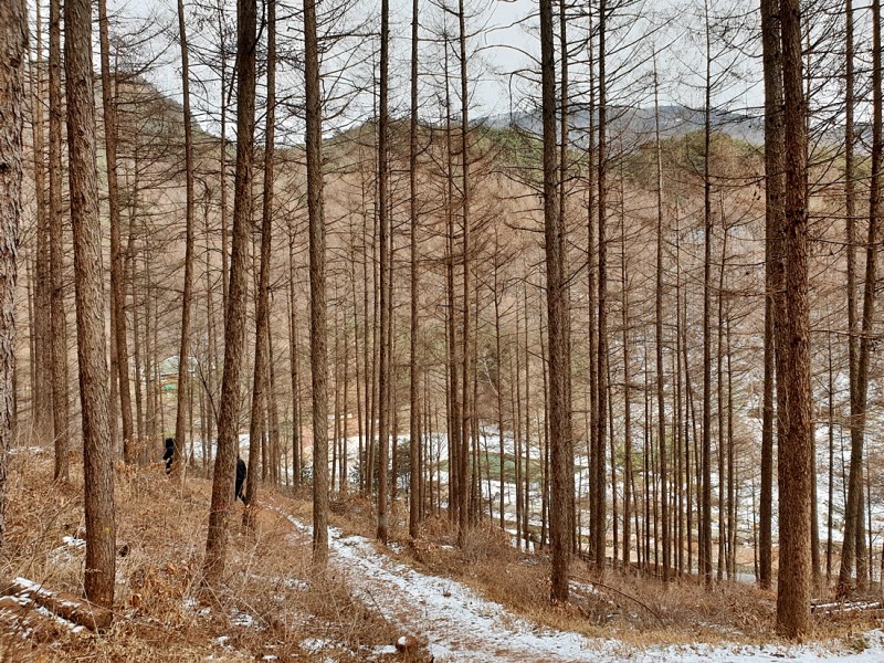 갈색의 나무숲과 지면 위로 얇게 깔린 잔설이