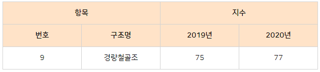 구조지수 중 경량철골조에 해당하는 구조지수가 변경되었는데요. 경량철골조는 비교적 살이 엷은 형강을 사용하여 꾸민 건축물의 구조로, 콘셋트 건물, 알루미늄 유리온실 등이 해당됩니다. 2019년 구조지수 75에서 2020년 77로 조정됐습니다.