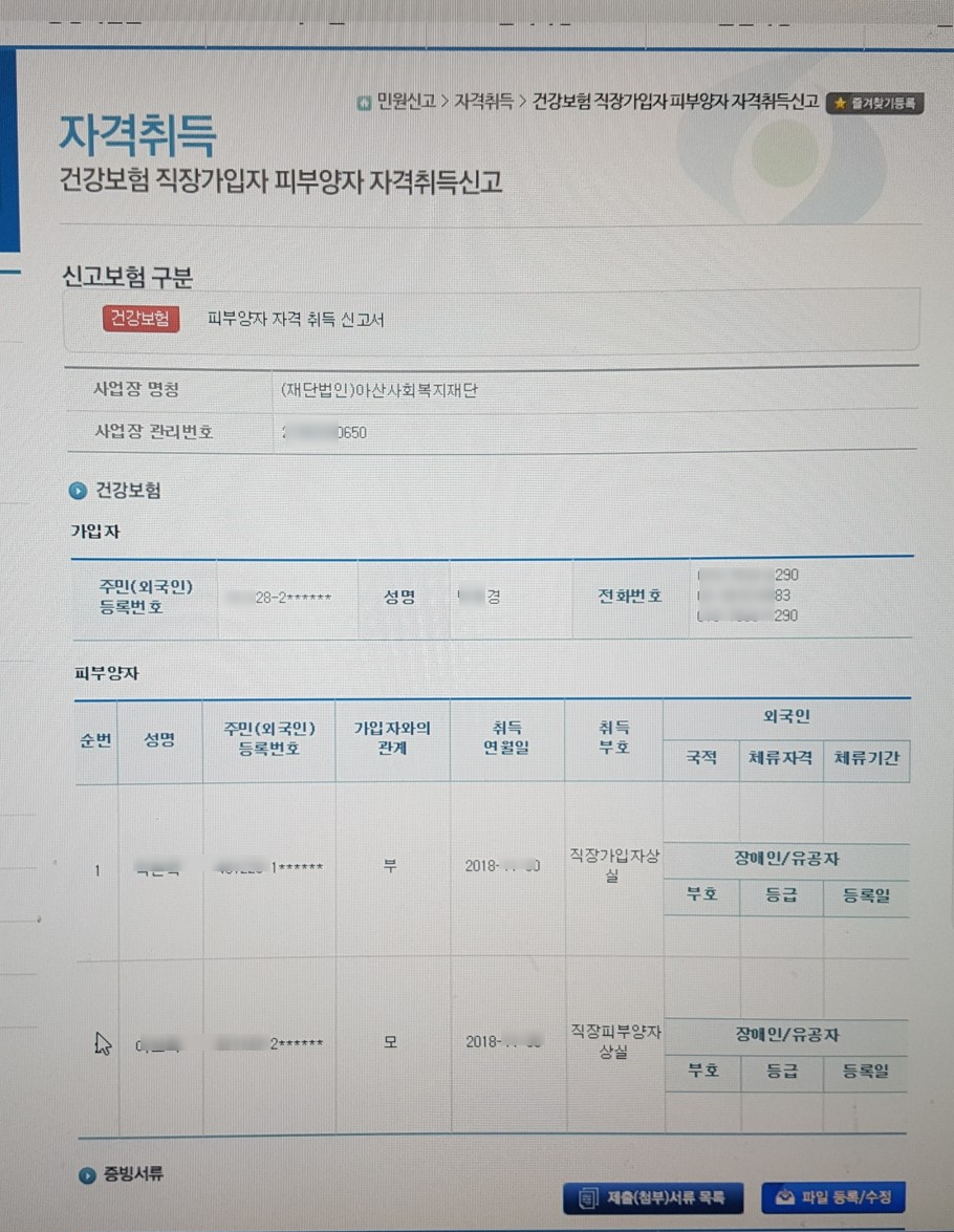 현재 직장 가입된 있는 분 기본 정보가 나오게 되며 아래 피부양자 자격 취득 신고 입력 칸이 나옵니다.