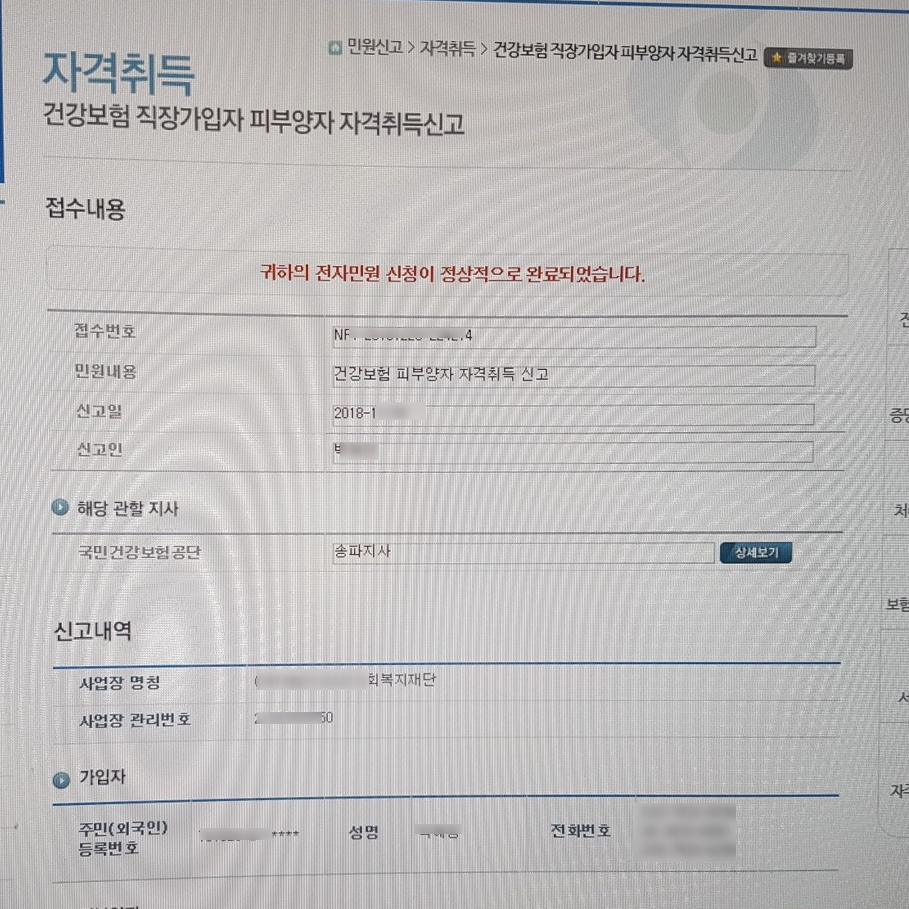 왼쪽 상단 민원신고 > 자격 취득 > 건강보험 직장가입자 피부양자 자격 취득신고 부분을 눌러 주세요.