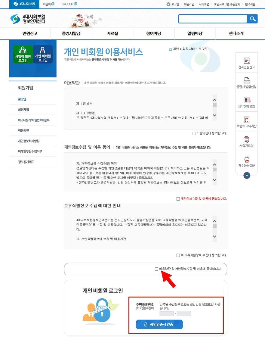 개인 비회원 서비스를 이용하기 위해 양관 동의 및 주민번호를 입력 후 공인인증서를 통해 로그인합니다.