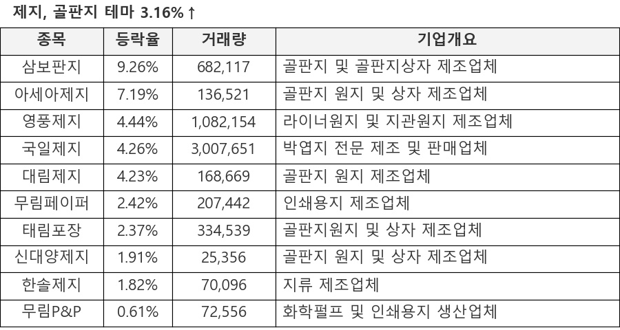 업종별로도 상승 업종이 우세. 종이목재(+3.83%), 운수장비(+2.44%), 비금속광물(+2.28%), 보험(+2.14%), 화학(+1.94%), 금융업(+1.65%), 증권(+1.57%), 서비스업(+1.36%), 전기전자(+1.31%), 유통업(+1.22%), 제조업(+1.20%), 의료정밀(+0.90%), 은행(+0.66%) 업종 등이 상승. 반면, 운수창고(-2.45%), 건설업(-1.62%), 섬유의복(-1.18%), 철강금속(-0.84%), 기계(-0.50%), 의약품(-0.43%) 업종 등은 하락.
