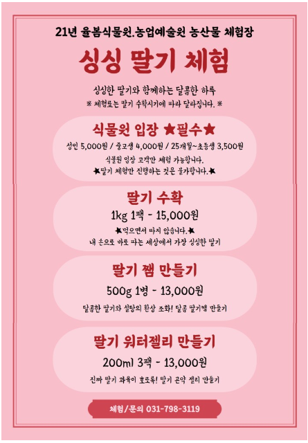 최종 목적지인 율봄 농산물 체험장인데요. 입장권 1매당 음료나 동물 먹이 중 선택하여 교환을 받을 수 있습니다. 체험장 안으로 들어서면 딸기향이 가득합니다. 현재 율봄 식물원에서 진행하는 체험 프로그램으로 동물 먹이주기 체험, 신나는 레일썰매장, 딸기 체험, 계절별 싱싱 농촌 체험을 진행하고 있습니다. 싱싱 딸기 체험은 예약자 우선으로 진행되는데요. 일주일 단위로 예약을 받는다고 합니다. 딸기잼 만들기, 딸기 워터젤리 만들기의 재미난 프로그램이 있는데요. 딸기 수확은 딸기 소진 시 체험이 마감될 수 있다고 하니 체험 예약 및 문의를 꼭 하시고 방문하셔야 할 것 같습니다!