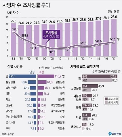 2017년 기준 주요 사망원인으로 <암(27.6%)><심장질환(10.8%)>