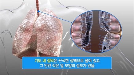 폐속에서는 점액질이 호흡을 돕게 되며 기도 섬모들은 폐속 오염물질을 점액으로 끌어올려 폐를 청소하게 됩니다.