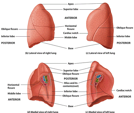 오른쪽 폐가 왼쪽 폐보다 폭이 넓지만 길이는 짧고 더 무거우며 전체 폐기능의 55%를 담당하게 됩니다.