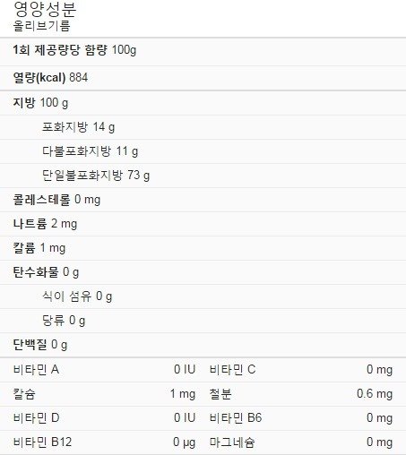 올리브 오일 100g에는 다음과 같은 영양소가 들어있습니다.