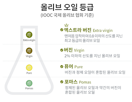 올리브 오일은 신맛이 강한 정도 즉 산도Acidity에 따라