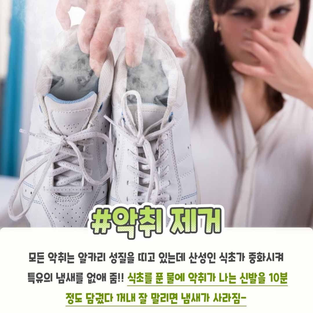 모든 악취는 알칼리 성질을 띠고 있는데 산성인 식초가 중화시켜 특유의 냄새를 없애준다. 식초를 푼 물에 악취가 나는 신발을 10분 정도 담궜따 꺼내 잘 말리면 냄새가 사라진다.