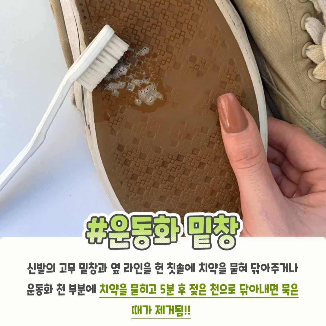 신발의 고무 밑창과 옆 라인을 헌 칫솔에 치약을 묻혀 닦아주거나 운동화 천 부분에 치약을 묻히고 5분 후 젖은 천으로 닦아내면 묵은 때가 제거된다.
