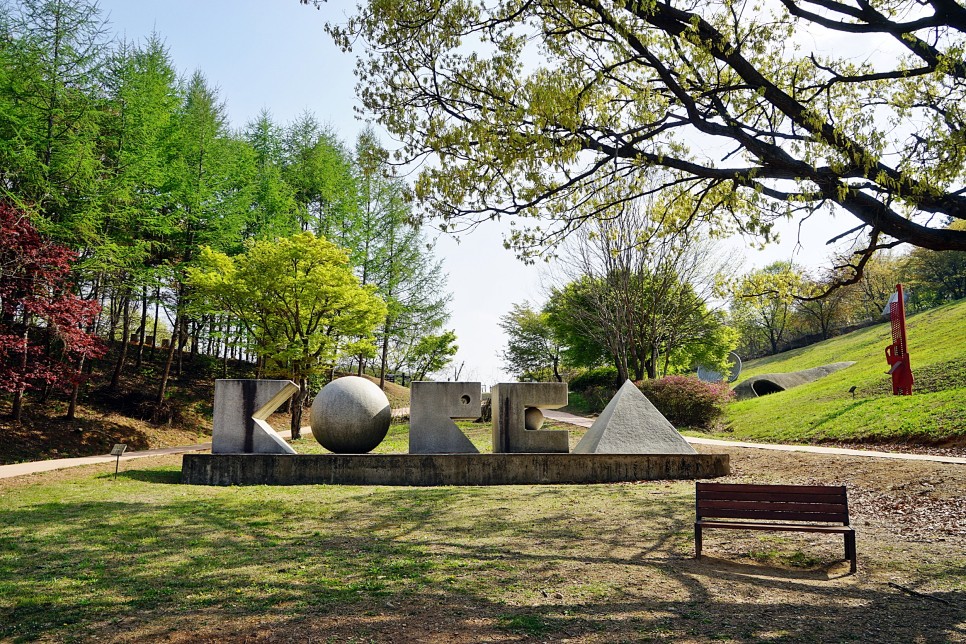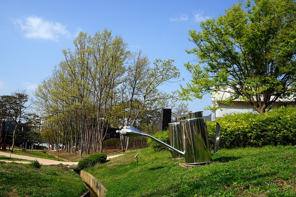 박물관 뒤쪽으로 이어진 조각 공원도 한 바퀴 둘러볼까요? 4월 초까지 흐드러지게 꽃을 피운 벚나무는 어느새 푸릇푸릇한 잎이 돋아났습니다. 곳곳에서 철쭉이 하나 둘씩 꽃망울을 터뜨립니다. 곤지암 도자공원은 산책로를 따라 한국정원, 장작가마, 엑스포 조각 공원, 스페인 조각 공원 등 볼거리가 많아 걷는 길이 지루하지 않아요. 조각공모전에 출품된 국내외 작가들의 작품이 눈길을 사로잡습니다. 공원 산책도 하고, 예술작품도 감상할 수 있으니 일석이조! 하늘아래 탁 트인 야외미술관 입니다. 공원 곳곳에 설치된 오두막 쉼터에서 잠시 쉬어가도 좋아요. 조금 더 긴 산책코스를 걷고 싶다면 청자봉, 백자봉까지 다녀올 수 있어요.