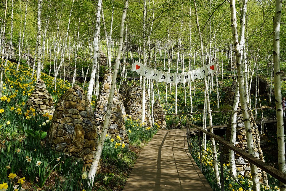 천년 화담송을 지나 약속의 다리를 건너면 본격적인 숲 산책코스가 시작됩니다. 철쭉 진달래 길, 자작나무 숲, 양치식물원, 소나무정원, 분재원, 암석 하경정원, 전통담장 길, 추억의 정원 등 17개의 테마 산책로가 이어져 즐겁게 산책을 즐길 수 있어요. 화담숲은 자연 그대로 식생을 보존하고, 친환경적인 생태공간으로 조성했는데요. 4월 말 화담숲에는 산수유, 진달래, 철쭉을 비롯해 복수초, 풍년화 등 봄 야생화가 꽃잔치를 벌입니다. 새소리, 물소리, 바람소리를 느끼며 숲길을 산책하는 것 자체만으로도 힐링이 됩니다.