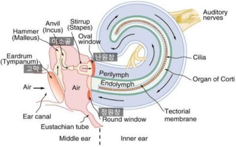 소리가 고막을 진동시켜 이소골을 통해 증폭되어 달팽이관으로 전달이 되고, 신경을 자극하여 따라 뇌에 신호가 전달되어 ‘소리’ 로 인식하게 된다.