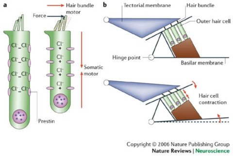 기저막이 흔들려 유모세포의 머리(hair)가 흔들리게 되면, 유모세포는 이 물리적 신호를 전기적 신호로 전달시킨다.