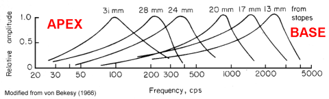 주파수가 큰 고음은 뻣뻣한 부분을 진동시켜 달팽이관의 앞쪽에서 진행파의 정점을 찍고, 주파수가 작은 저음은 가장 먼 곳에서 진행파의 정점을 찍는다.