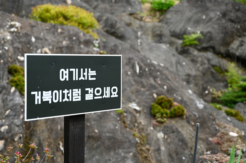 ‘여기서부터는 거북이처럼 걸으세요’라는 푯말이 인상적입니다.
