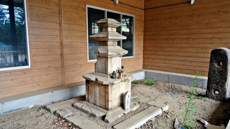 공사 가림막 앞에는 삼층석탑이 자리하고 보수 완료된 대웅전과