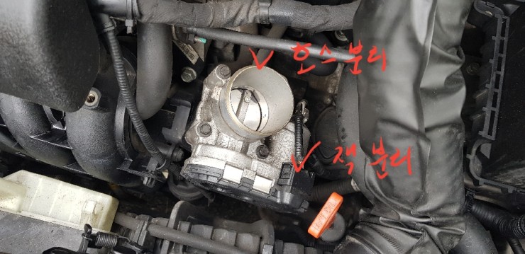 스로틀바디 아래에 있는 호스를 분리해주시면 됩니다.