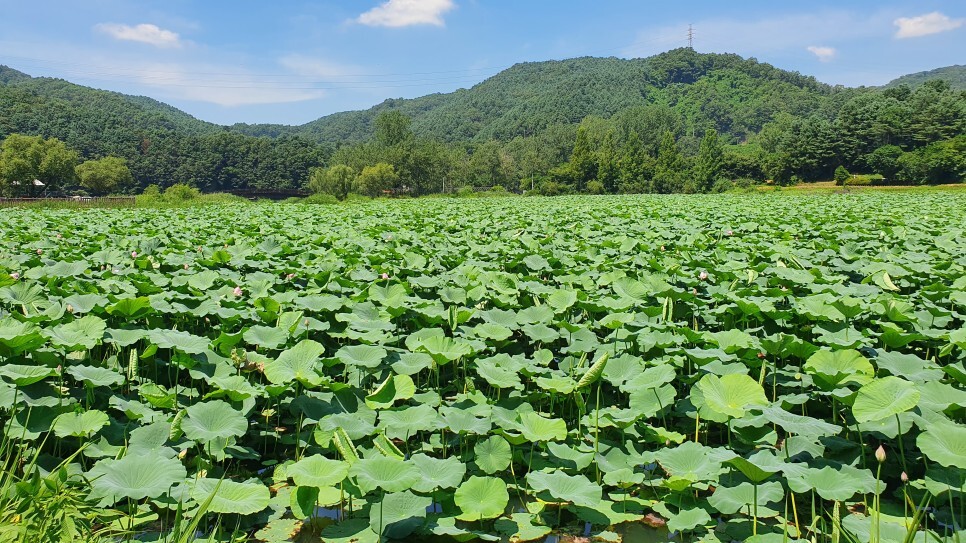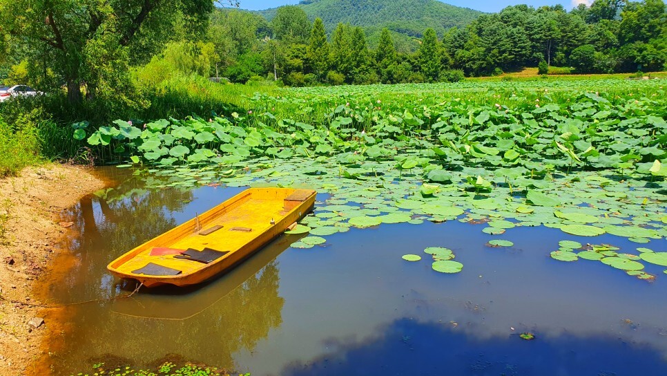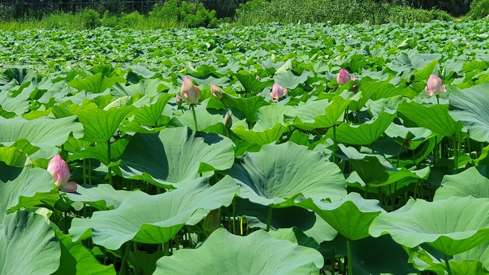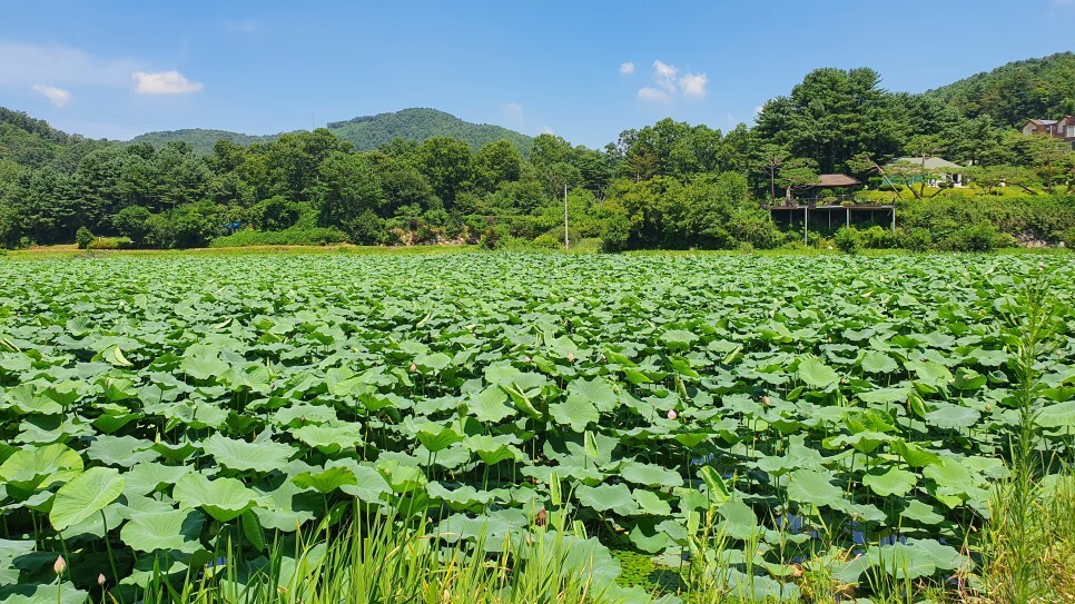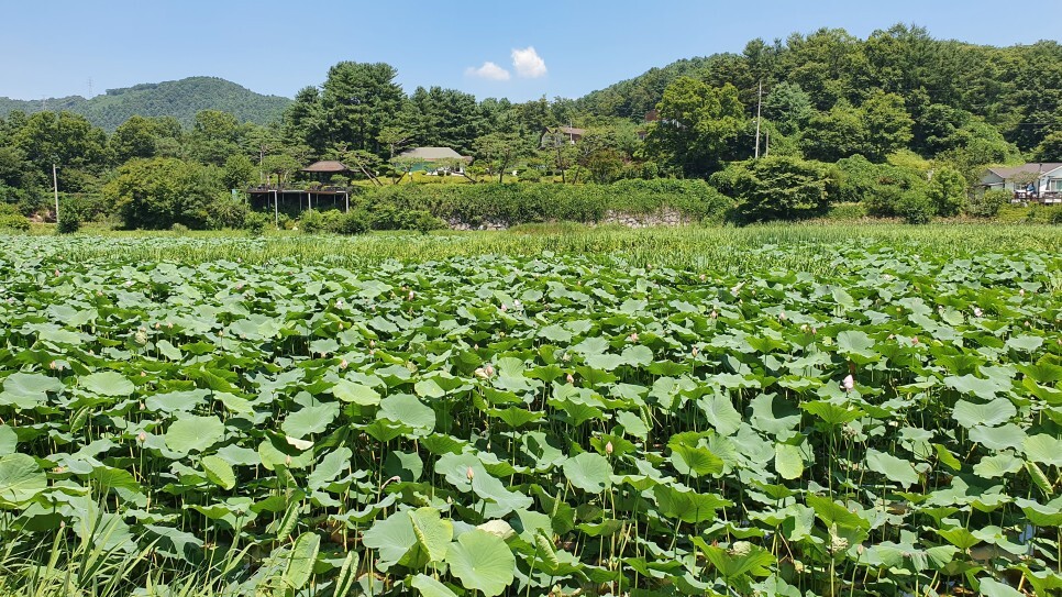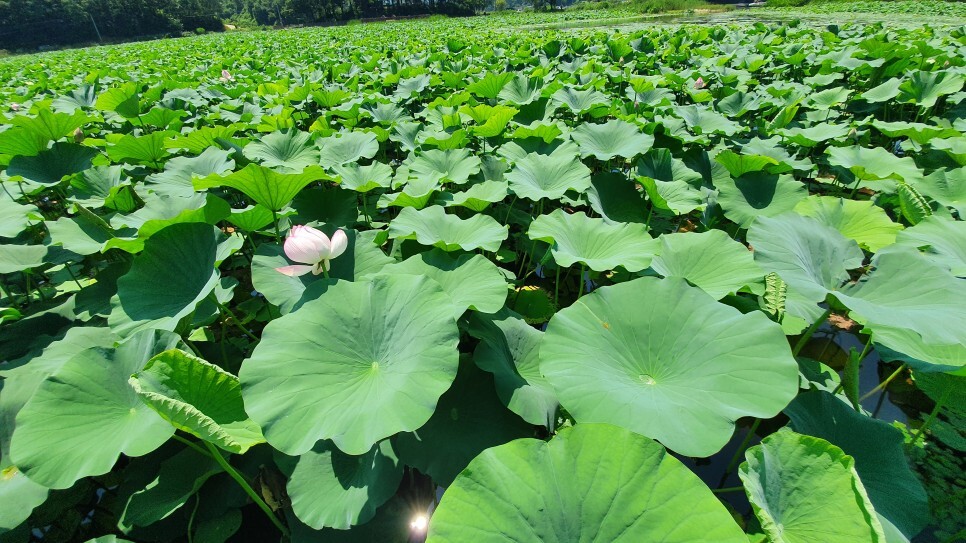 멀리서 바라보는 것만으로도 장관이었는데 가까이서 보니 연잎단지의 규모가 정말 어마어마하더군요. 마을앞에 자연적으로 형성된 넓은 호수의 80%를 푸른 연잎이 뒤덮고 있었습니다. 창문을 내리자마자 연잎 특유의 상쾌하고도 싱그러운 향기가 차안으로 가득 풍겨왔는데, 여름에만 느낄 수 있는 자연의 향기라 생각하니 계절을 제대로 즐기는 듯한 기분이었습니다. (*주차장은 별도로 마련되어 있지 않으며 차량통행에 방해가 되지 않는 갓길에 주차를 하시면 될 듯 보였습니다.)