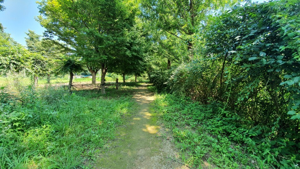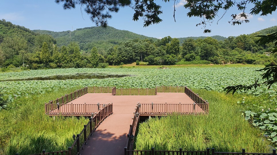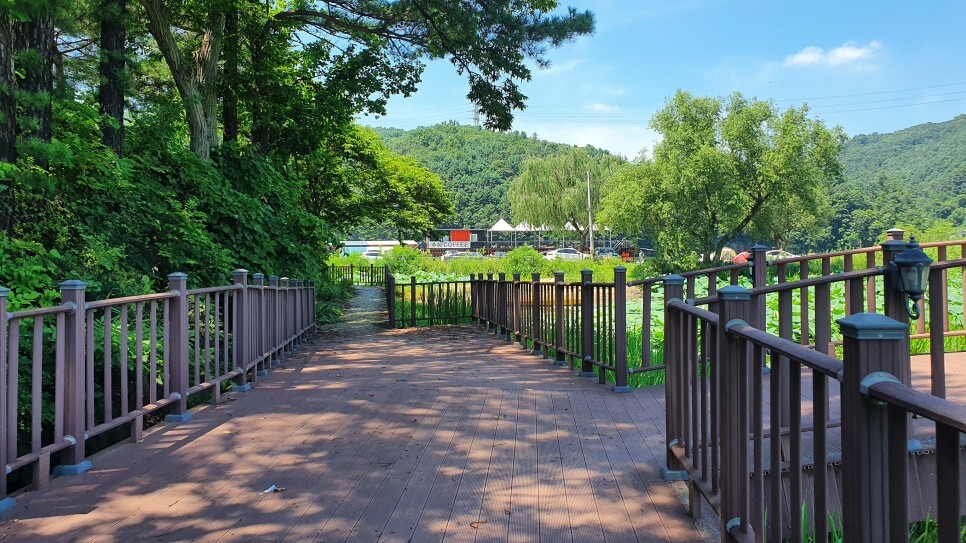 이곳에는 호수를 한바퀴 돌 수 있는, 방문객을 위한 둘레길이 조성되어 있는데요. 비록 조성된지 오래되어 산책로의 일부가 낙후된 느낌이 들지만 걷는데는 아무 문제가 없었습니다. 산책로는 데크길, 논두렁길 등 다양한 형태로 조성되어 있는데, 연꽃을 좀더 가까이에서 구경할 수 있는 관찰데크가 두곳에 설치되어 있고 강과 호수가 연결되는 지점에는 구름다리도 설치되어 있어 산책이 지루하지가 않습니다. 특히 산책로 옛 물미나루터 지점에서는 잔잔한 홍천강의 아름다운 풍경을 마주할 수 있으니 꼭 한번 들려보시길 바랍니다.