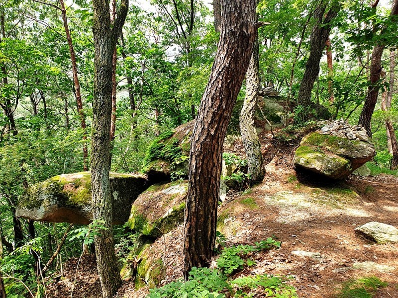 계곡으로 내려가기 전 거북 바위부터 먼저 만나게 됩니다. 소나무 사이로 3개의 바위가 거북이의 머리 등 다리 형상입니다.
