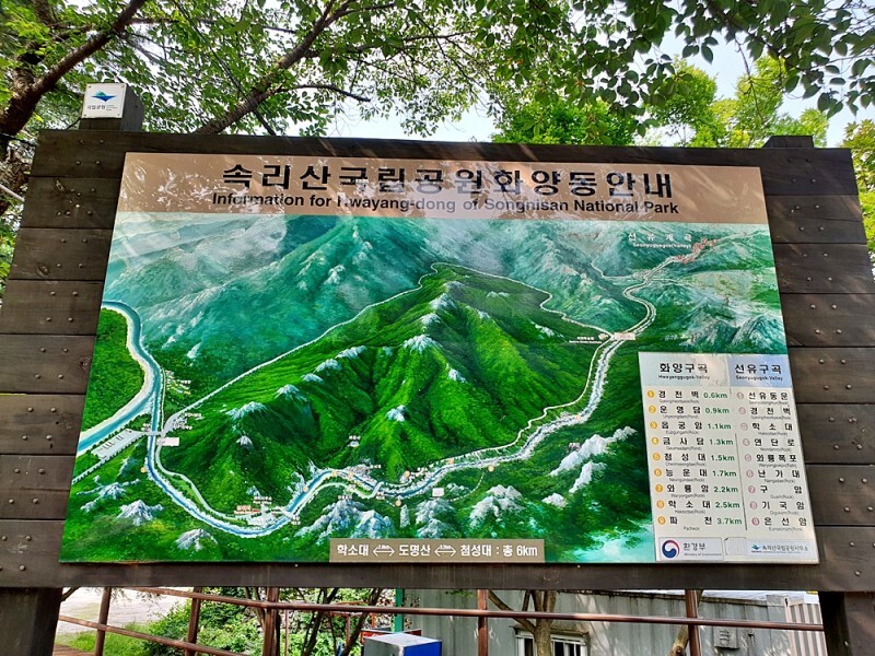 화양구곡은 가령산, 도명산, 낙영산, 조봉산 등이 둘러싸고 있습니다. 계곡 중간중간 등산로 이정표가 있으며 이곳은 도명산 등산로 입구입니다.