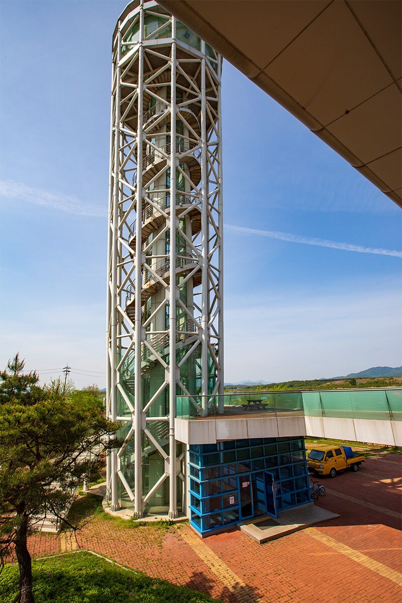 여주보 공도교 위에서 바라본 여주보 홍보관과 전망대. 홍보관은 임시 휴관인 줄은 알았지만, 전망대까지 못 오를 줄 몰랐습니다. 그래서 더 아쉬움이 컸습니다.