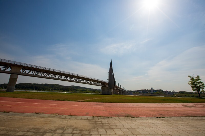 홍보관 옆으로 6층 높이의 전망대가 있어 그곳에 오르면 시원하게 남한강을 내려다볼 수 있고 그곳에 트릭아트가 있어 재미난 사진도 찍을 수 있습니다.