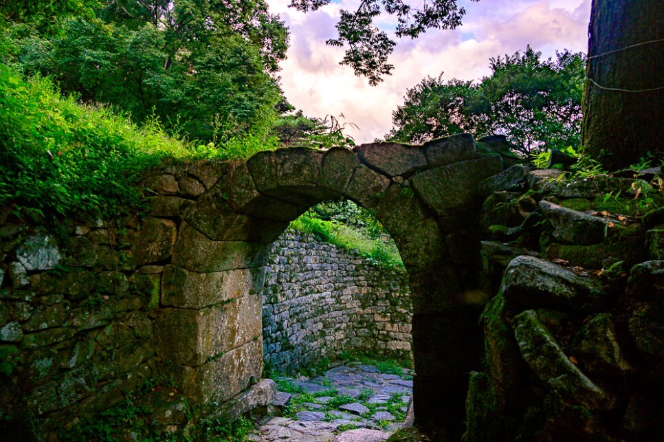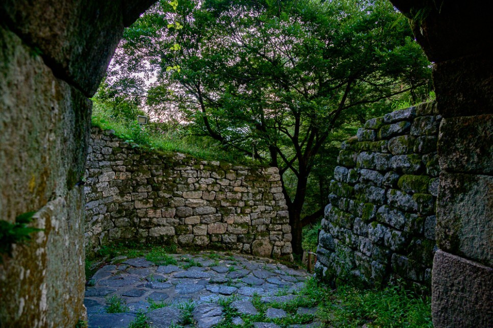 다른 지역에서 보지 못한 ㄱ자로 굽은 성 입구의 반월형 출입문을 볼 수 있습니다.