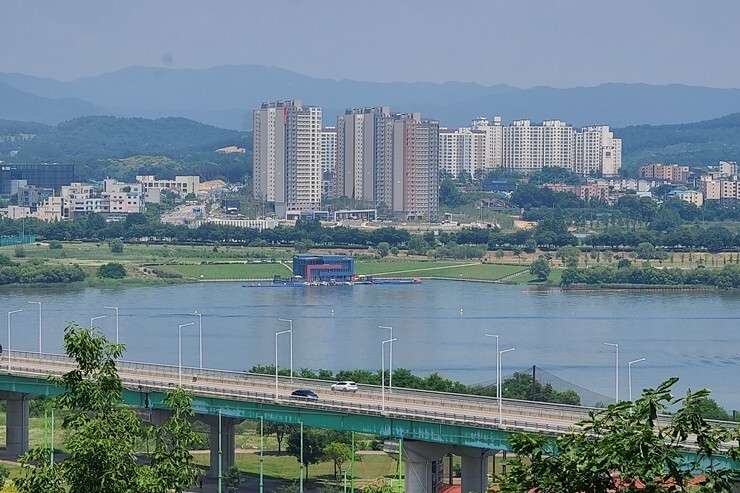 발 아래 세종대교가 남한강을 가로지르고 그 아래는 양섬지구공원이 있고 강 건너에 여강을 누비는 수상레저가 있는 여주세종수상센터가 보입니다.