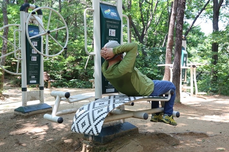걷는 것만으로도 땀이 나지만 운동시설로 건강을 다지며 몸풀기 운동을 해도 좋아요. 트윈트위스트, 트윈바디싵업, 윗몸 일으키기 등 운동기구가 있습니다.