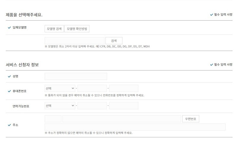 위니아 홈페이지에서 제품 모델명과 신청자 정보 등 간단한 서식을 작성하니 무상수거&무상점검을 바로 신청할 수 있었습니다.