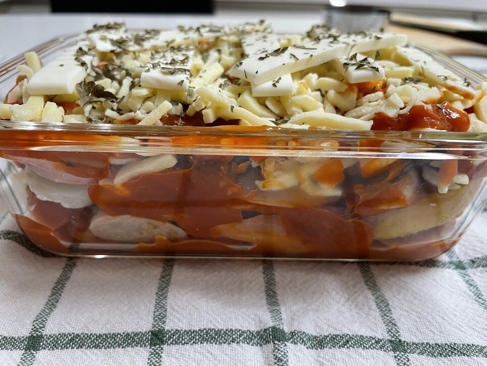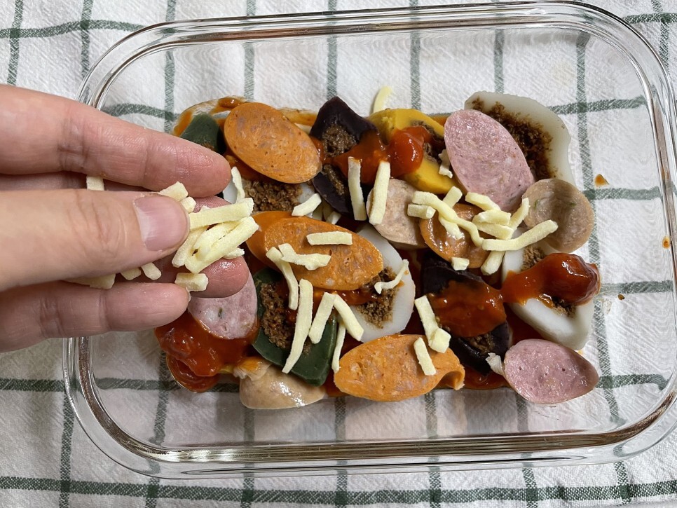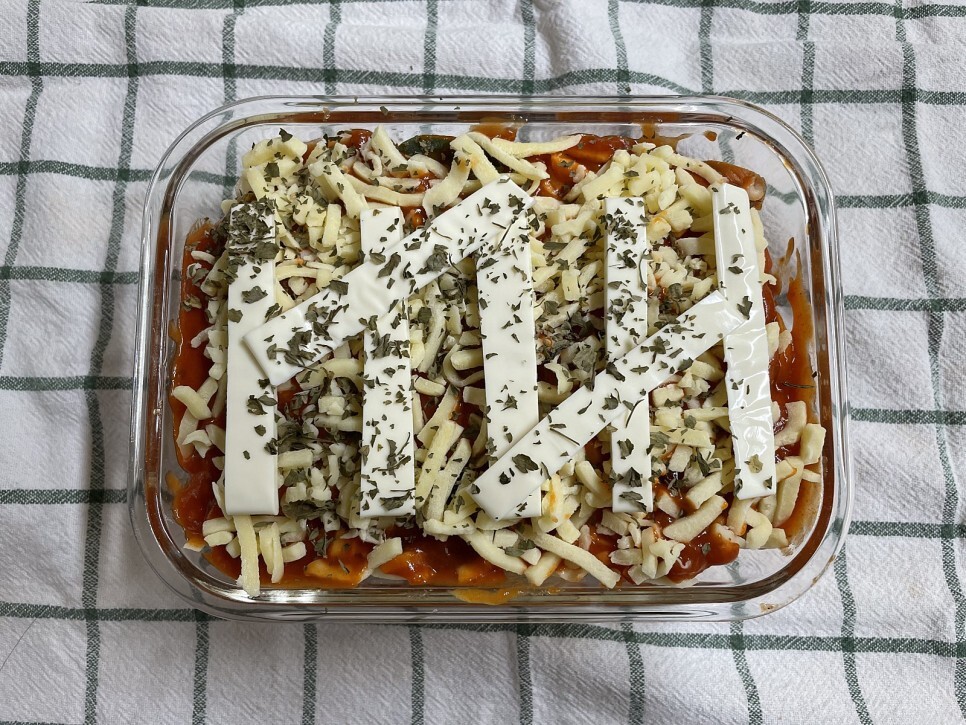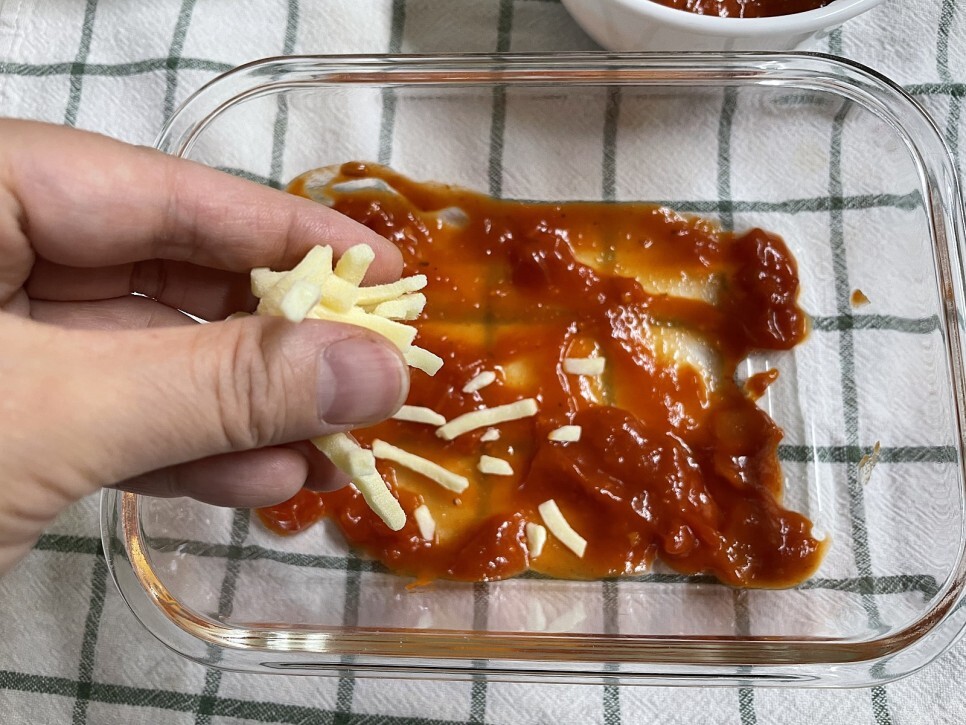 가장 윗 부분에 치즈를 듬뿍 뿌리고