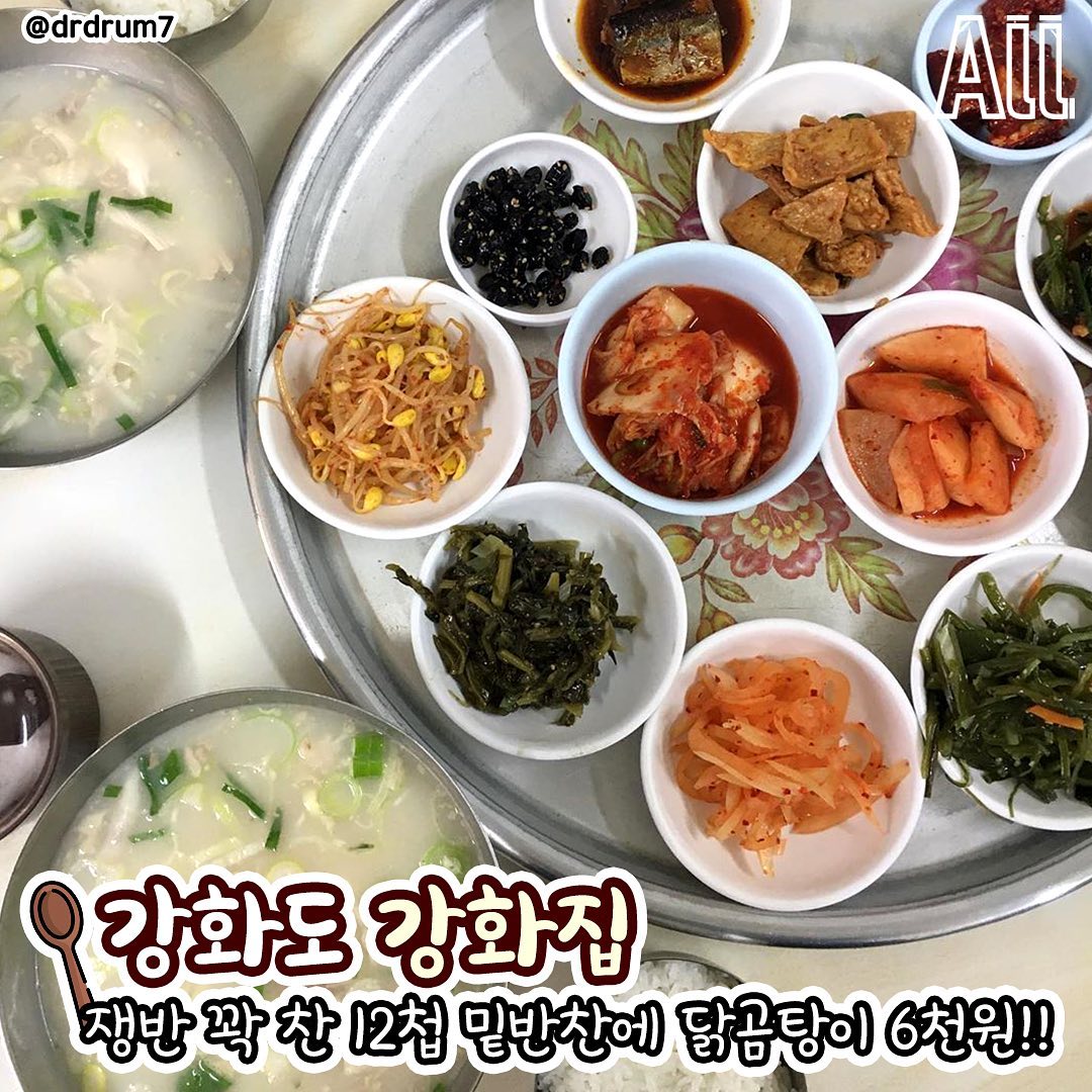쟁반에 꽉 찬 12첩 밑반찬에 닭곰탕이 6천원이다.